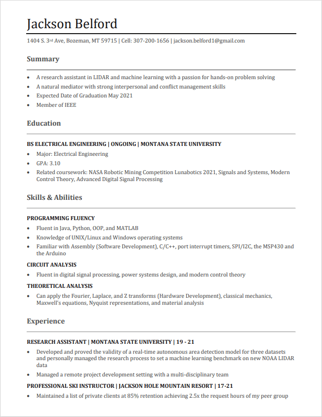 Born in Jackson, MS and raised in Jackson, WY, I was a more active athlete than active student in high school. Playing baseball and football, competing in big mountain free skiing, as well as skateboarding and acting; I prioritized activities where I believed I could challenge myself over academics which came rather easily. After a series of knee injuries (ACL tears) I bucked down and focused on performing well in my Advanced Placement classes which allowed me to enter the Electrical Engineering program and Montana State University.